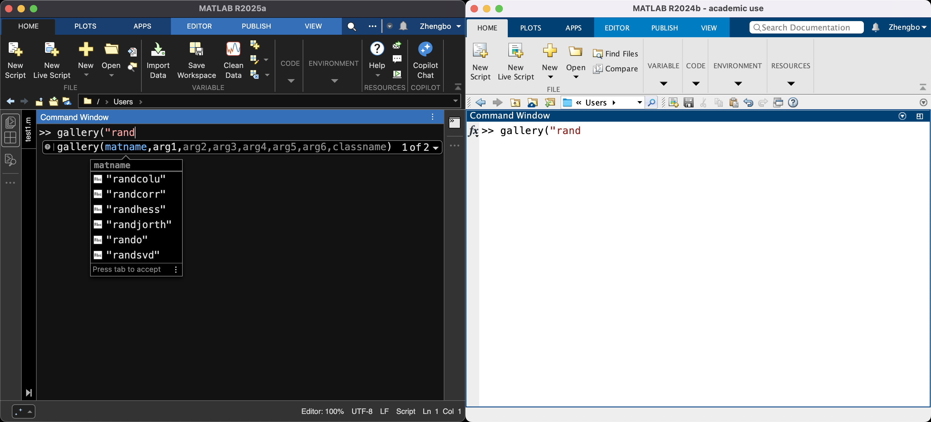 ode supports more objectsode can solve delay differential equations (DDEs) by specifying the Solver property as "dde23", "ddesd", or "ddensd" and specifying the DelayDefinition property as an odeDelay object. If the user only specifies DelayDefinition, then ode automatically selects a solver.ode can solve ordinary differential equations (ODEs) with complex solution values by specifying SeperateComplexParts as "on". This is useful for solving implicit and stiff ODEs where the Jacobian is not specified.One can now work with Copilot inside MATLAB desktop. Now, there is a dedicated sidebar panel for Copilot chat, which can answer questions, help write and explain code, and identify code issues. Thanks to MATLAB's super detailed documentation and the technical articles, Copilot can make use of them and provide reasonable and meaningful skeleton codes. By pressing Shift+Command+P (MAC) or Shift+Ctrl+P (WIN) in the Editor, one can directly ask Copilot to generate some code for you without needing to copy and paste from the Copilot chat.